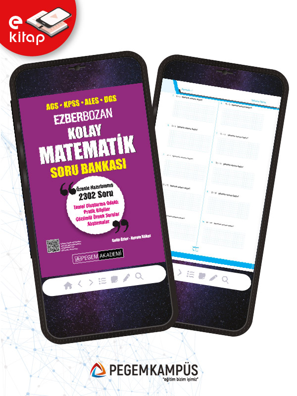 KPSS • ALES • DGS Kolay Matematik soru bankası yayınımız, matematik altyapısı olmayan ya da öğrenim hayatına uzun süre ara vermiş öğrencilerin konuları aşamalı şekilde çalışabilecekleri şekilde planlanmıştır. Dolayısıyla öğrenciler, çok sayıda alıştırma ile ilgili konulardaki soruları rahatlıkla çözebildiklerini fark edecekler ve konular için bir alt yapı oluşturabileceklerdir. Düzenli, sabırlı ve dikkatli bir çalışmayla matematiğin hiç de zor ve korkulacak bir ders olmadığını anlayacağınız bu kitap temel bir başvuru kaynağı olacaktır. Yayınımız içeriğinde aşağıda verilen temel konular yer almaktadır.